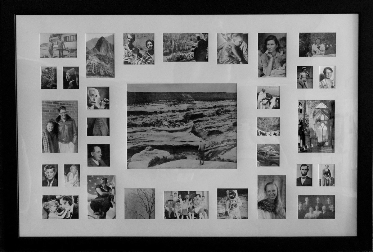 I wanted to put some of us dust-people together in this family frame. The pictures include the famous and the obscure, people who are still alive and people who aren’t, some we would consider good or virtuous, and some with whom we wouldn’t want to think we had anything in common. There are some family photos, a couple of presidents, and some trees and animals to remind us of our kinship with other creatures made of dust with life breathed into them. There’s a picture of Dresden after it was destroyed by Allied bombing in WWII, and Tintern Abbey, which was destroyed during the reformation, and the little pickup truck that got wrapped around a telephone pole with me in it last year. There’s Fred Rogers, Tenzing Norgay and Edmund Hillary, and C.S. Lewis. Harriet Tubman, Marilyn Monroe, Eleanor Roosevelt, Adolf Hitler, and my cat. Each photo has part or all of the phrase written across it on the glass: “Remember that you are dust, and to dust you shall return.”